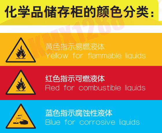 【备注】产品有红(红色指示可燃液体)、黄(黄色指示易燃液体)、蓝(蓝色指示弱腐蚀性液体)三种颜色,三种颜色的尺寸相同,储放化学品类型不同。在储存化学品的过程中,使用有色标签来识别、整理、分开各种易燃或危险液体。这样做同时又能在发生火灾时方便消防人员识别危险。